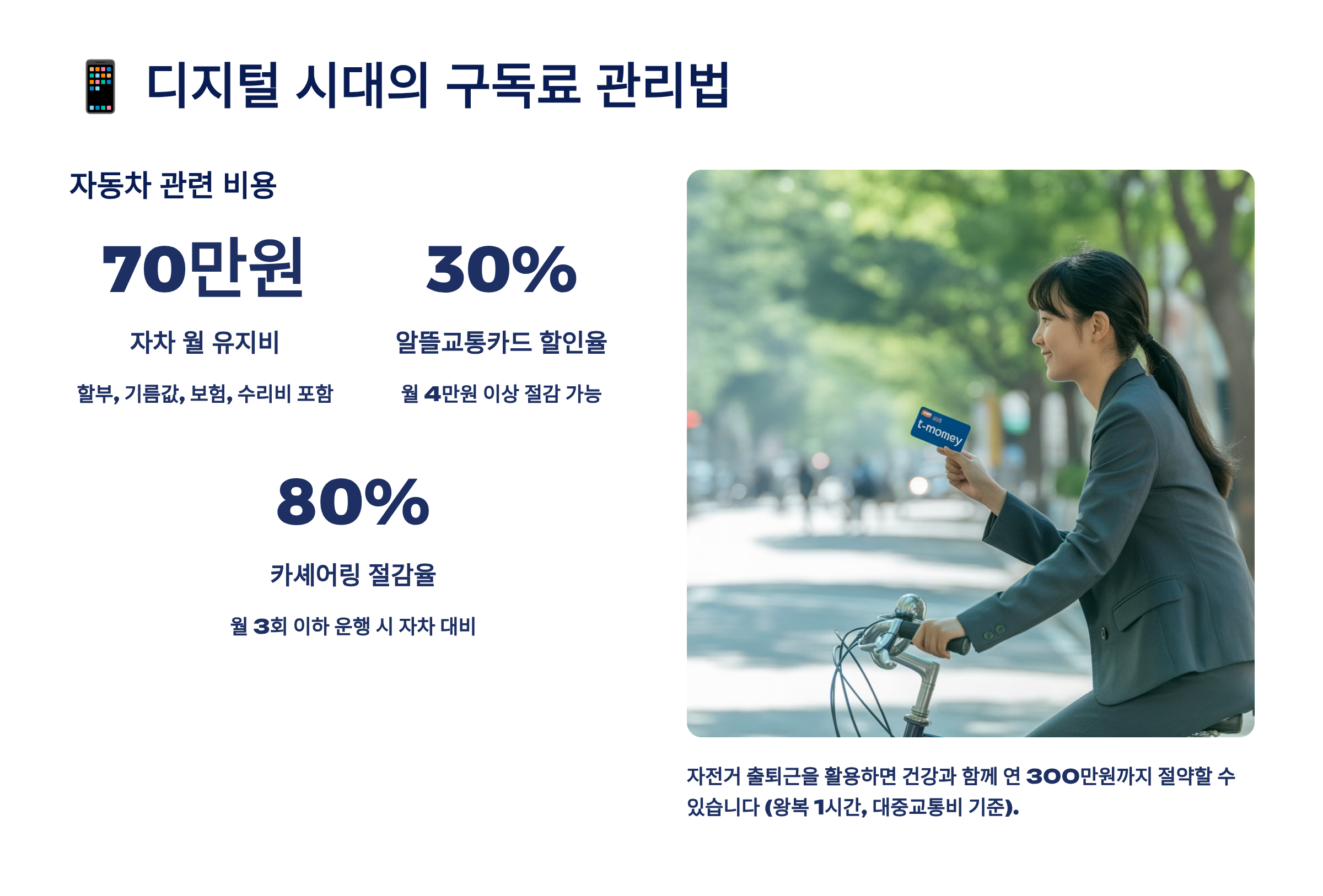 | 대중교통 정기권 | 6-7만원 | 경제적이고 친환경적 |