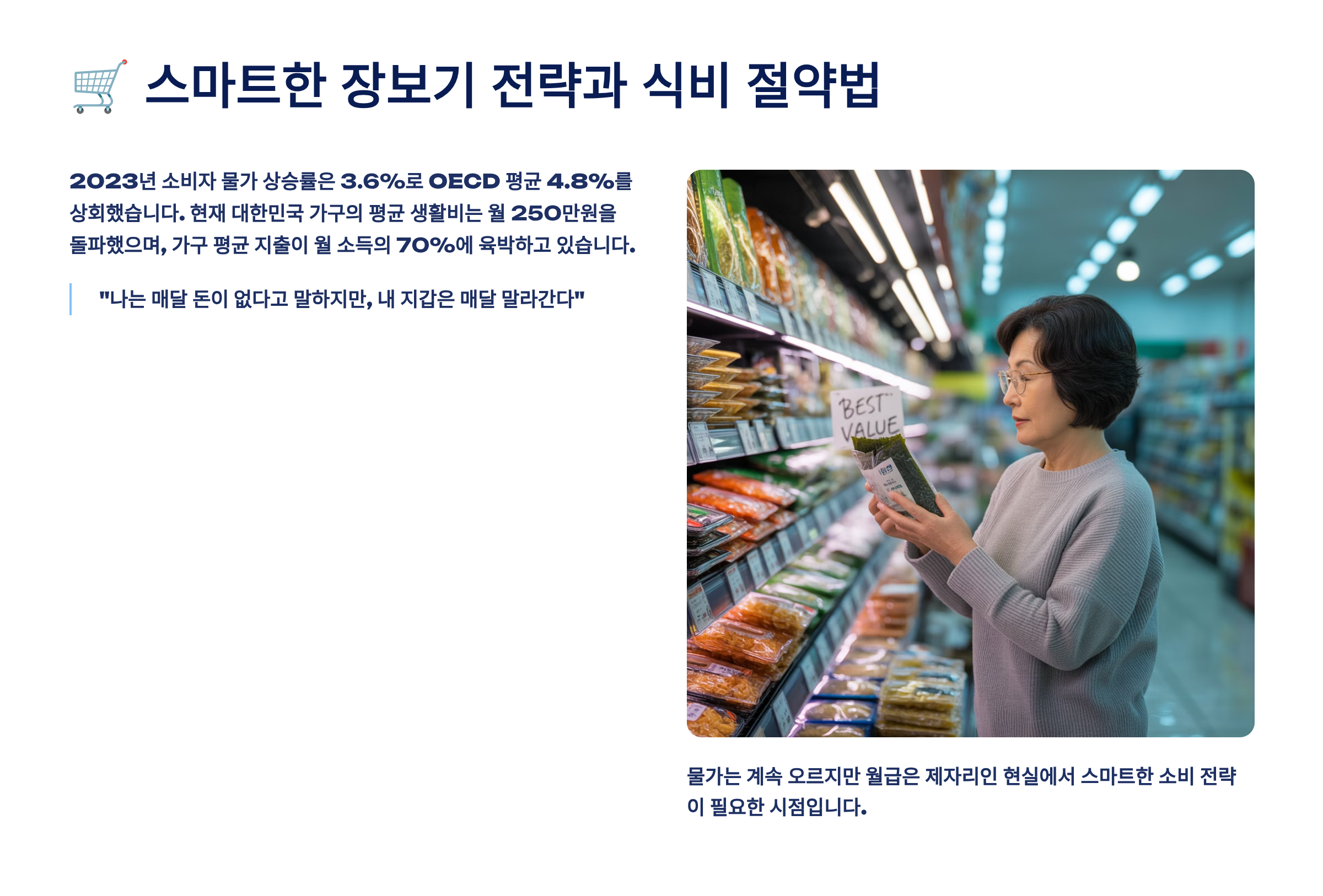 우선 장보기 전에 반드시 식단표를 작성하고 필요한 재료만 리스트업하세요. 충동구매를 막을 수 있고, 식재료 낭비도 줄일 수 있어요. 저는 일주일 단위로 식단을 짜고, 대량구매가 가능한 품목은 한 번에 구입해서 소분 보관하고 있어요.
