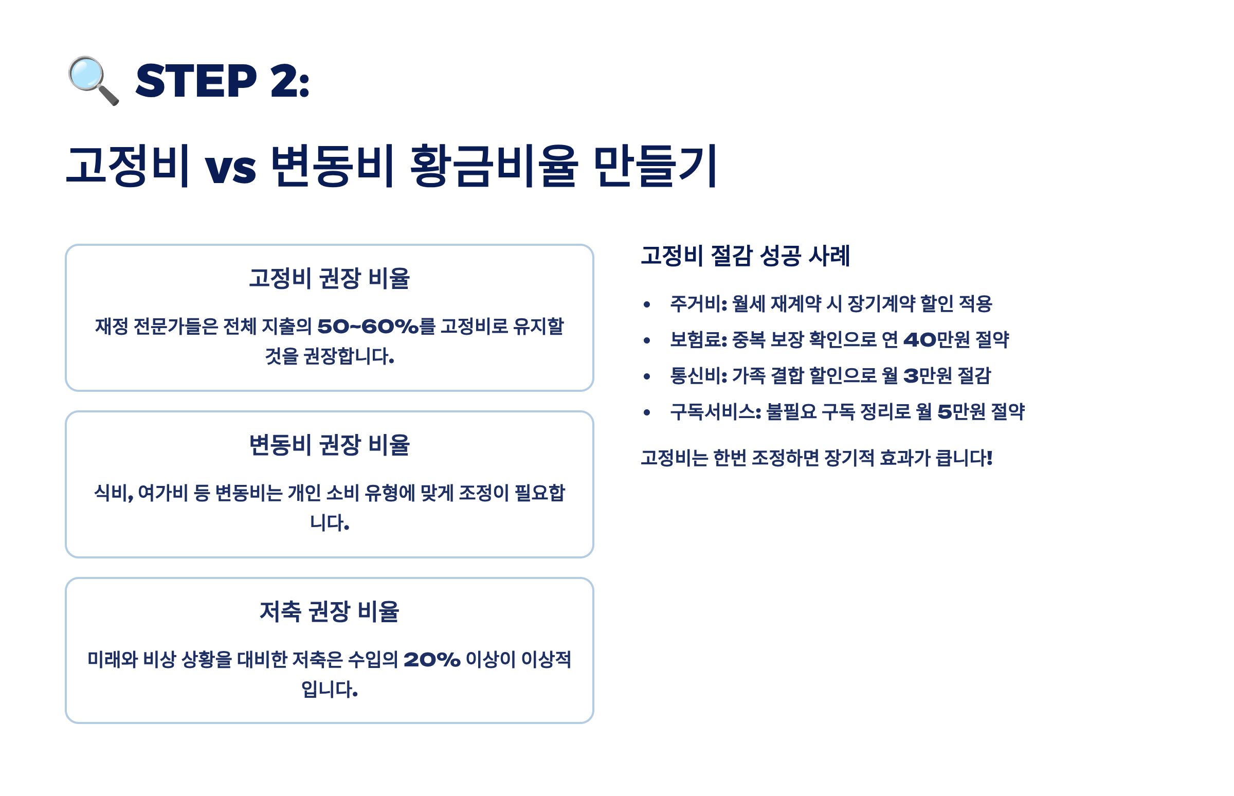 재정 전문가들이 입을 모아 강조하는 것이 바로 '고정비와 변동비의 균형'이에요. 2025년 기준으로 이상적인 비율은 고정비 50%, 변동비 30%, 저축 20%라고 해요. 하지만 현실은 어떨까요? 대부분의 사람들이 고정비 70%, 변동비 25%, 저축 5%의 불균형한 구조를 가지고 있답니다. 이런 구조에서는 아무리 절약해도 돈이 모이지 않아요. 지금부터 여러분의 고정비와 변동비를 정확히 파악하고, 황금비율을 만드는 방법을 알려드릴게요!