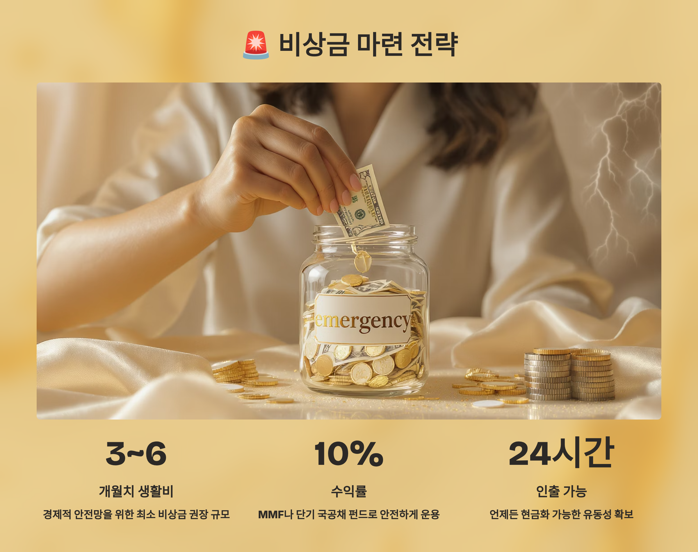 비상금은 절대 투자하지 마세요! 주식이나 펀드에 넣으면 필요할 때 손실을 보고 팔아야 할 수도 있어요. 비상금은 '보험'이라고 생각하세요. 수익률은 낮지만 마음의 평화를 주는 안전장치예요. 이 안정감이 있어야 나머지 돈으로 과감한 투자도 할 수 있답니다! 🛡️