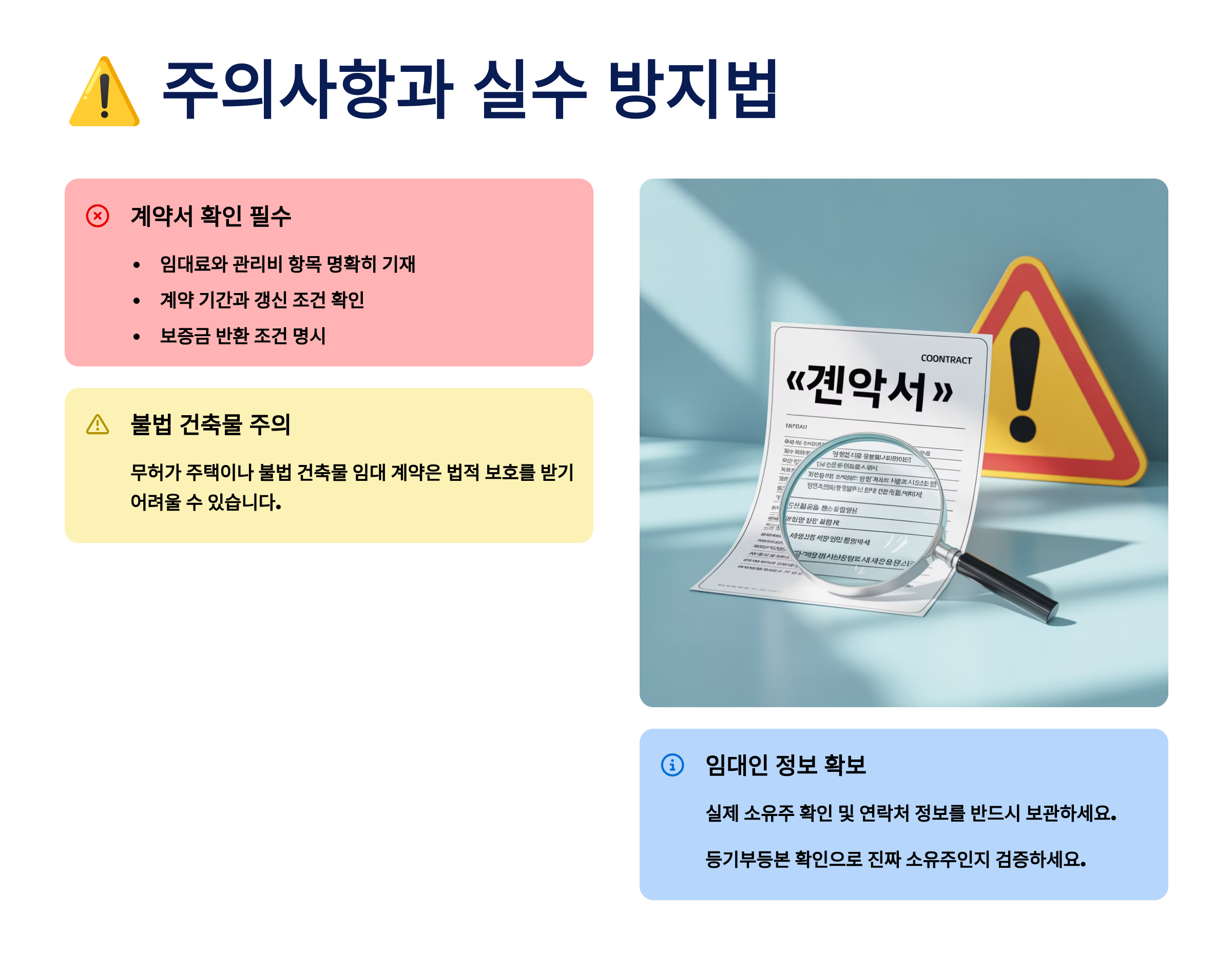 월세를 절약하려다가 오히려 더 큰 손해를 보는 경우도 있어요. 저도 처음엔 여러 실수를 했었고, 주변에서도 비슷한 실수를 하는 분들을 많이 봤어요. 오늘은 제가 경험한 실수들과 그것을 방지하는 방법들을 공유해서 여러분은 같은 실수를 하지 않으셨으면 좋겠어요.